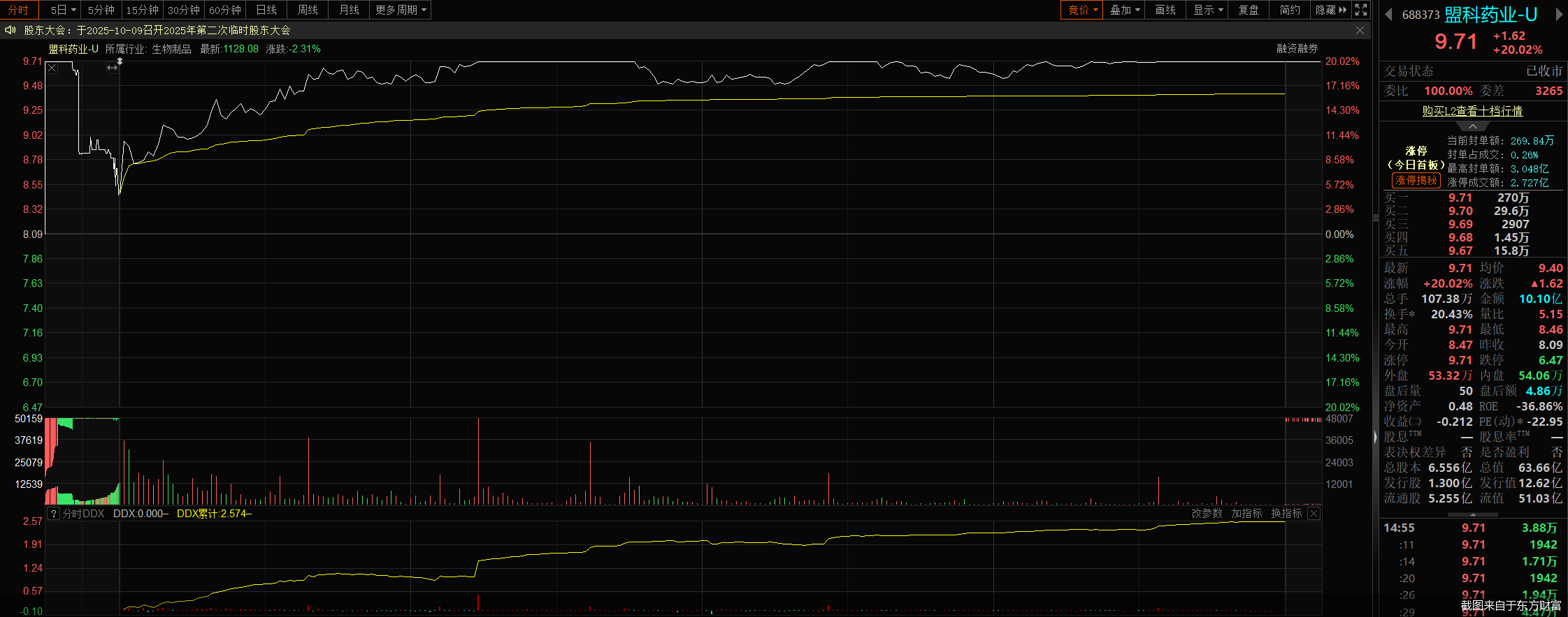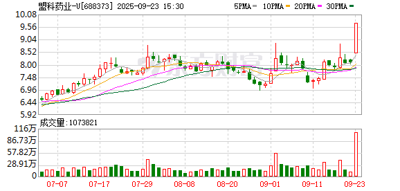 交易行情显示,9月23日,盟科药业高开4.7%,开盘价为8.47元/股,盘中股价震荡上攻并封上涨停。截至当日收盘,盟科药业报涨停价9.71元/股,涨幅为20.02%。全天成交金额为10.1亿元,换手率为20.43%,总市值达到63.66亿元。